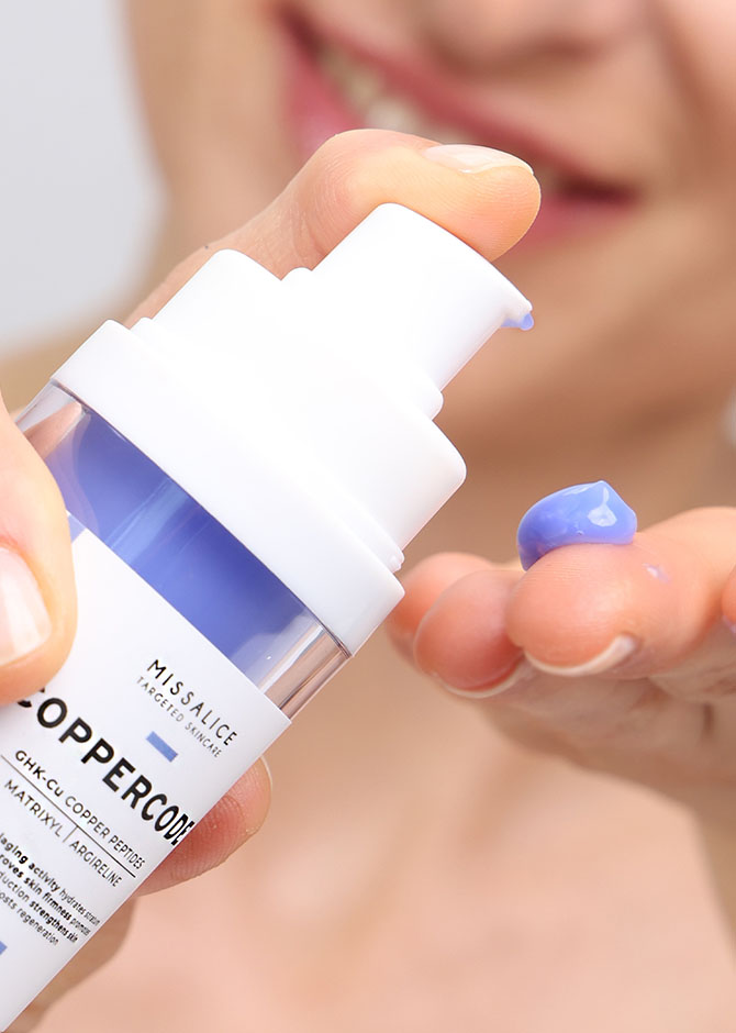 Apply COPPERCODE once or twice a day, in the morning and/or evening. For best results, layer it on top of a hydrating serum, such as ROYAL AF or any serum you normally use.