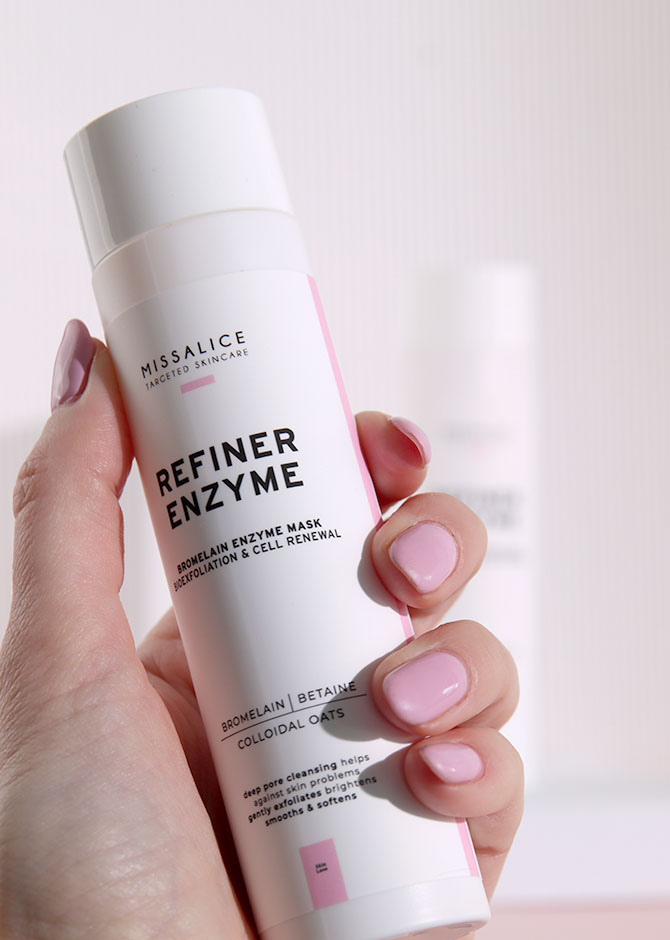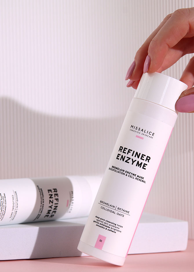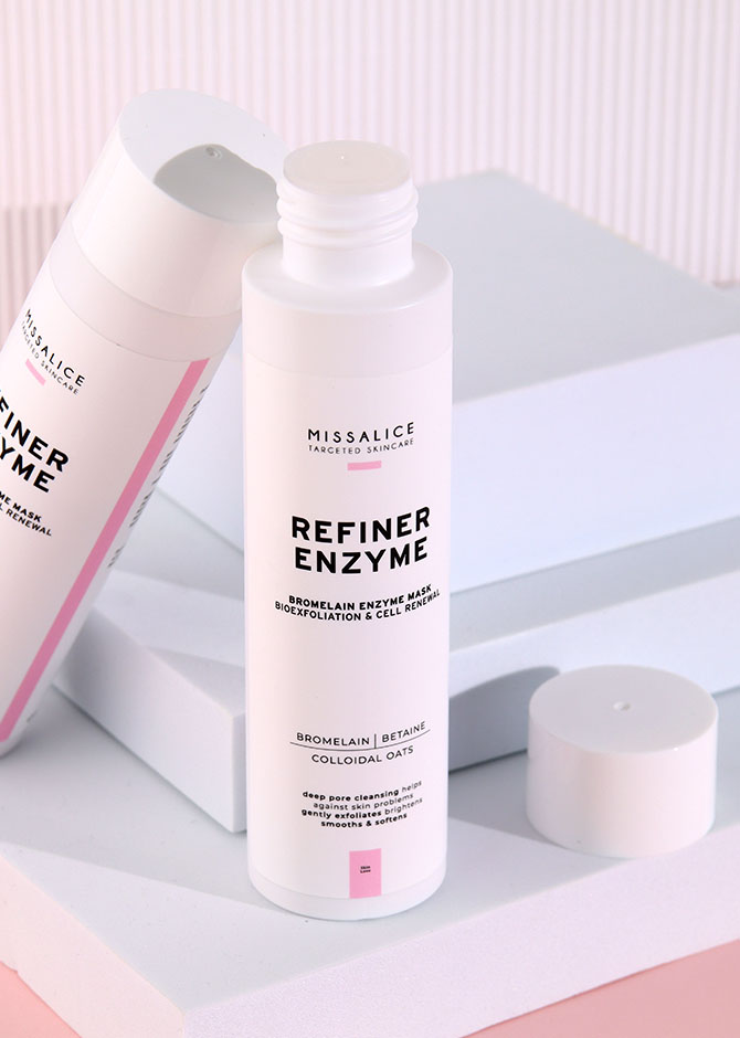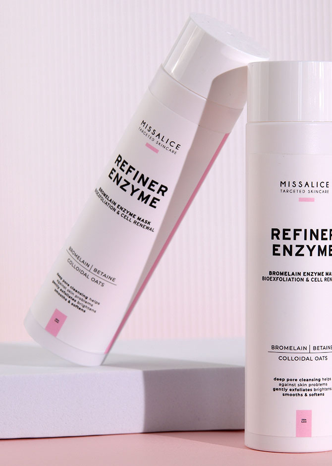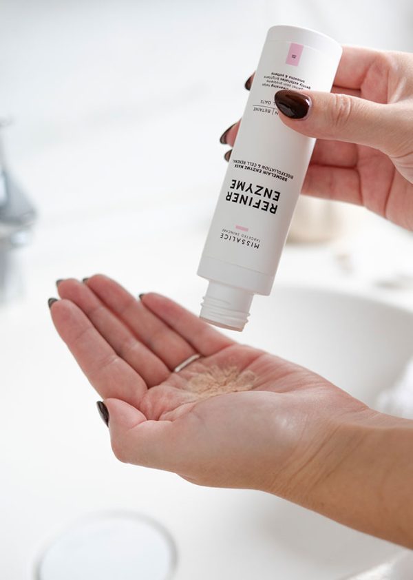 Use REFINER ENZYME as a gentle facial mask. Place a small amount of powder in the palm of your hand and add a little lukewarm water to create a smooth paste, which activates the enzymes. Apply evenly over the face and leave on for 2–3 minutes. Rinse thoroughly with lukewarm water before the paste fully dries to avoid over-drying the skin.